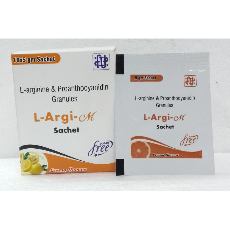 L-Argi-M Granules is a dietary supplement with L-arginine and proanthocyanidin. L-arginine is an amino acid found in poultry, fish and dairy that helps build proteins. Proanthocyanidins are antioxidants with anti-inflammatory and vasodilating properties.